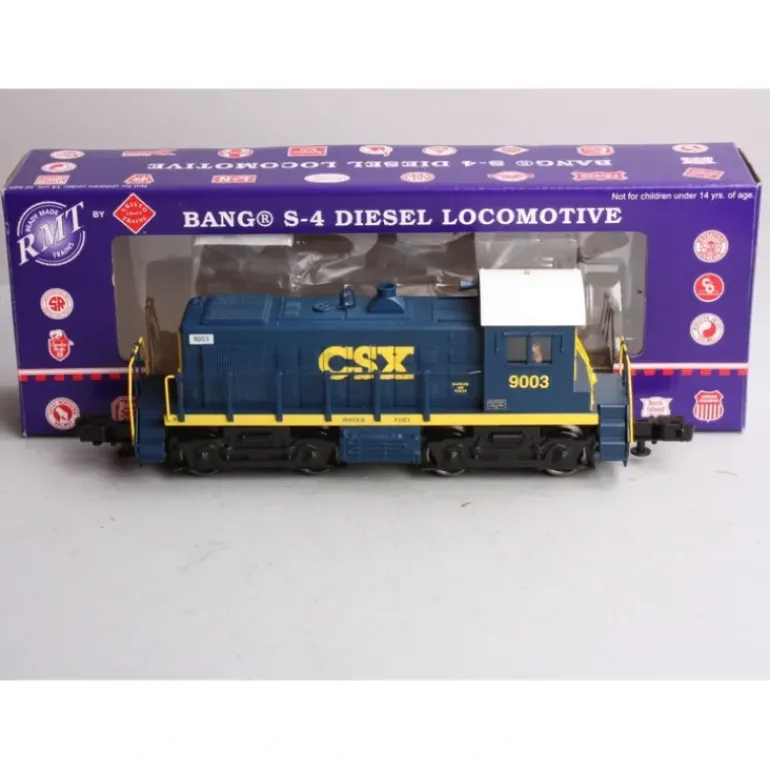 Here is an RMT 92304 O CSX Bang S-4 Powered Diesel Switcher #9003 (3 Rail). This locomotive features plastic body construction, dual motors, metal handrails, operating metal couplers, flashing roof beacon, directional headlights and rear marker lights. For use with most 0/0-27 Gauge 3-rail toy trains.