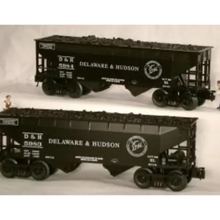 Here is a RMT 96256 O Gauge Delaware & Hudson 2-Bay Hopper (Pack of 2). Features include realistic painting, prototypically inspired lettering on sides AND ends, opening hopper doors, metal brake wheel, metal trucks w/metal side frames and spring detail, operating diecast couplers w/air brake hose detail, ‘Easy-roll’ metal wheels, removable coal load, and a separate standing brakeman figure.