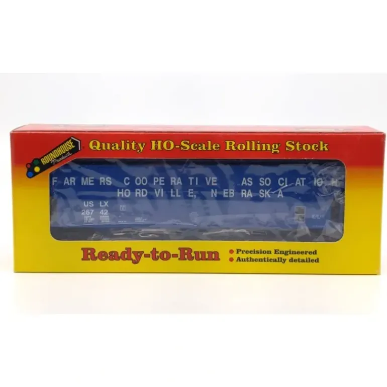 Here is a Roundhouse 35207 HO Farmers Co-Op 54′ FMC Covered Grain Hopper #26742. This car features plastic construction, plastic trucks, plastic wheels and axles, and horn hook couplers.