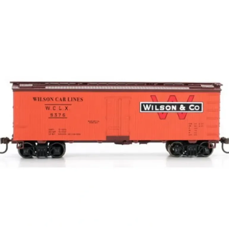 Here is a Roundhouse 85505 HO Scale Wilson & Co. 36′ Meat Reefer #9376. This car comes fully assembled and ready for your layout. It features factory installed wire grab irons, wire truss rods, razor sharp painting and printing, body mounted couplers, machined RP25 profile 36 inch metal wheels, and McHenry scale knuckle spring couplers.