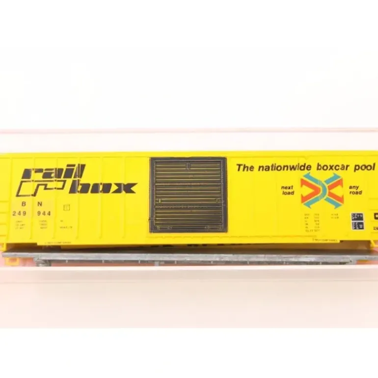 Here is a Roundhouse 8840 N Scale BN Railbox Box Car #249944 Kit. This item comes disassembled with plastic construction.