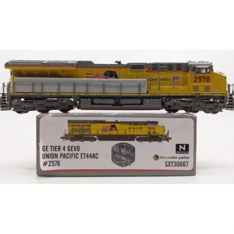 Here is a Scale Trains SXT30667 N Union Pacific ET44AC Diesel Locomotive #2578. This product features a plastic construction with a motor, metal wheels and operating knuckle couplers.