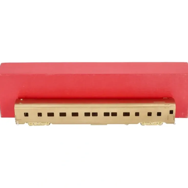 Here is a Soho 2002 HO Scale Brass Illinois Central Chicagoland Sleeper. This car features an unpainted brass body, brass trucks, and metal wheels. It measures approximately 11 inches in length.