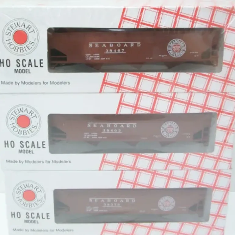 This is an Stewart 10304 HO Scale Seaboard Air Line 70-Ton Three-Bay Triple Offset Hopper (6). These easy-to-build HO Scale plastic models feature one-piece, prepainted and lettered bodies. Kits include trucks and weights. Coupler pockets accept Kadee(R) couplers.