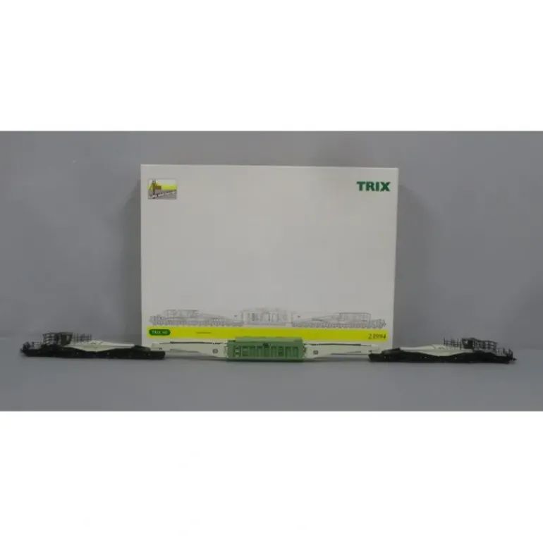 This is an HO Scale Trix 23994 Extreme Load Flatcar. It is two very long flatcars combined to hold a Trafo-Union Transformer between them. An unbelievably huge car. Features include metal construction, plasic trucks, hook couplers, metal wheels and axles.