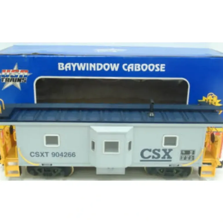This is a USA Trains 12063 G CSX Lighted Bay Window Caboose. Feature battery-charging circuit for flashing ETD light on rear (included), interior lighting, quality graphics and handrails and ladders.