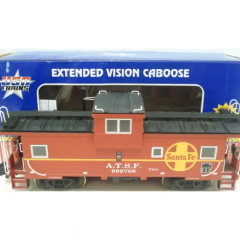 This is a USA Trains 12101 G Santa Fe Lighted Extended Vision Caboose. Feature battery-charging circuit for flashing ETD light on rear (included), interior lighting, quality graphics and metal wheels, handrails and ladders.