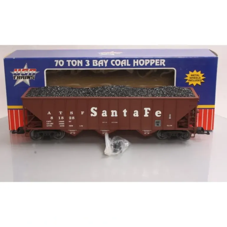 This is a USA Trains 14002 G Atchison, Topeka & Santa Fe 70-Ton 3-Bay Coal Hopper #81826. Each hopper features opening bottom hatches, detailed brake system, coal load and metal wheels. Cars are Kadee coupler-compatible.