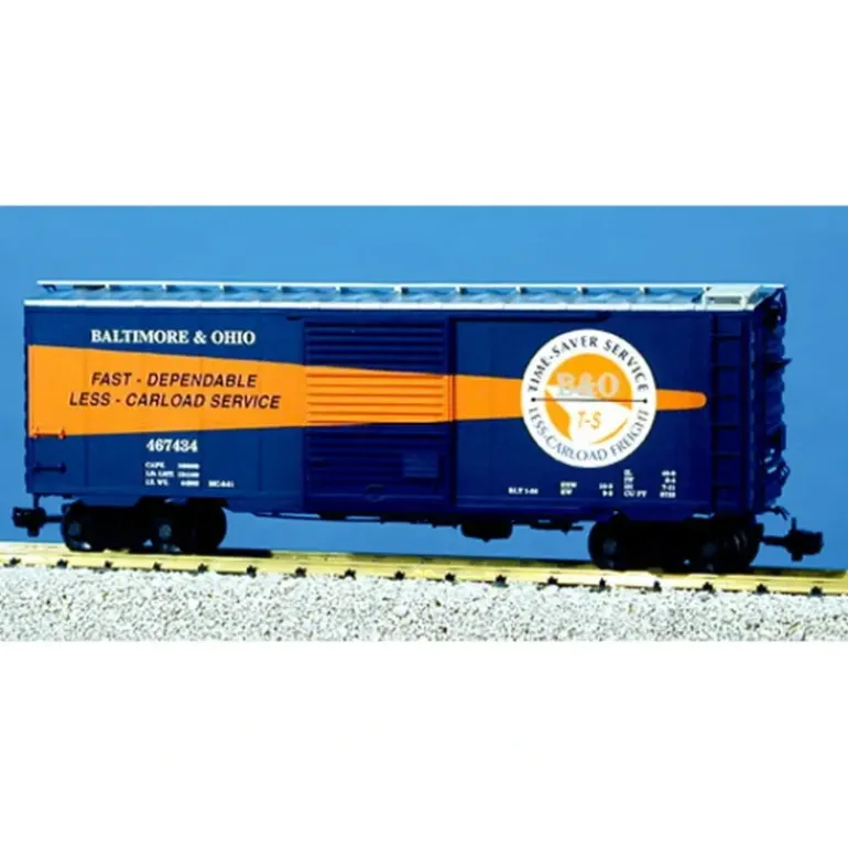 This is a USA Trains 19220C G Baltimore & Ohio 40′ Boxcar #467434. This car features plastic construction, plastic trucks, metal wheels and axles, and knuckle couplers.