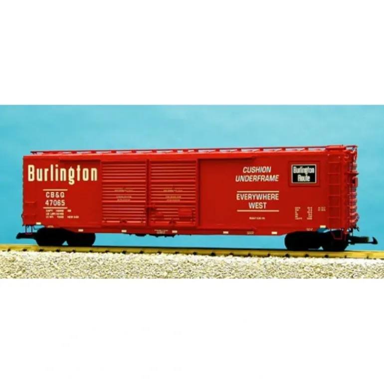 This is a USA Trains 19313B G Burlington 50′ Boxcar. Features welded panels with rivet details, detailed underframe, Bettendorf trucks, see-through roof walks and grates on small platform, brass coupler lift bar and separately molded handrails, ladders and corner steps.