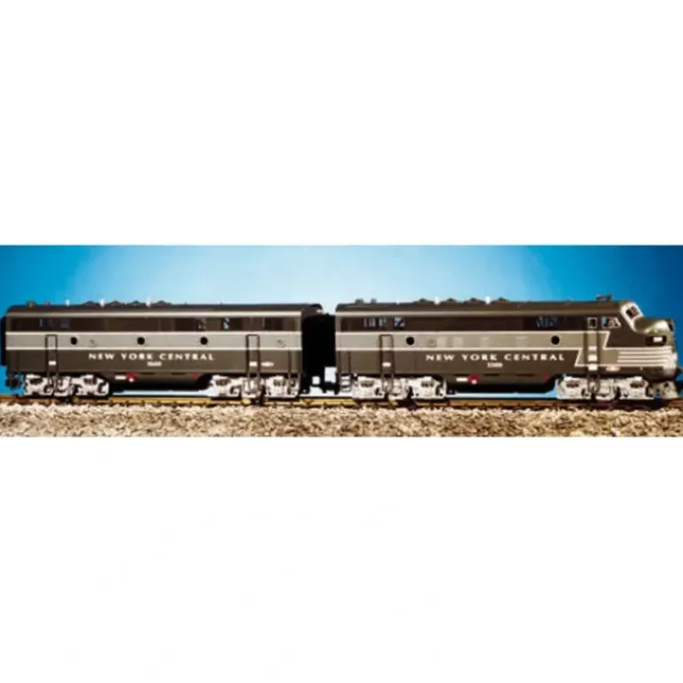 This is a USA Trains 22252 G New York Central F-3 AB Diesel Locomotive Set. Model features dual powered trucks on both units, dual smoking stacks on both engines, back-up light on B unit, red/green directional marker lights, real metal screens on roof and side and lighted number boards. Models measure 20-3/4 in length and 5-3/4 in height.
