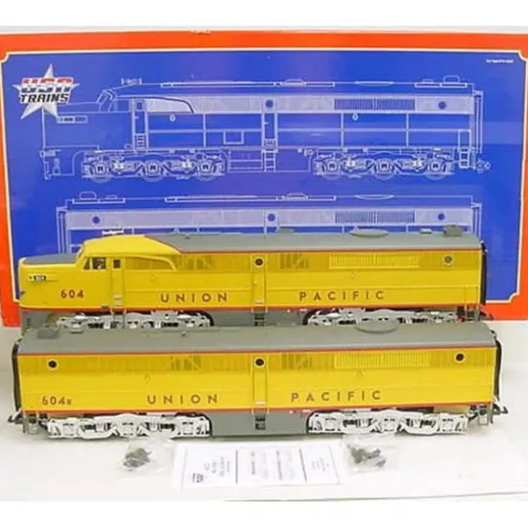 This is a USA Trains 22403 G Union Pacific ALCO PA-1 & PB-1 Diesel Locomotive Set. Dual powered six wheel trucks, Operating smoke stacks on both units, Two road numbers for ABBA operation, Lighted number boards, Red/Green directional marker lights, Real metal side screens, and Road Number Matrix.