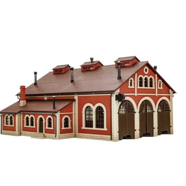 This is a Vollmer 47609 N Scale Three-Track Locomotive Shed Building Kit. Size: 7-1/4″” x 5-7//8″” x 1-5/16″” or 18.5 x 15 x 9.5cm.