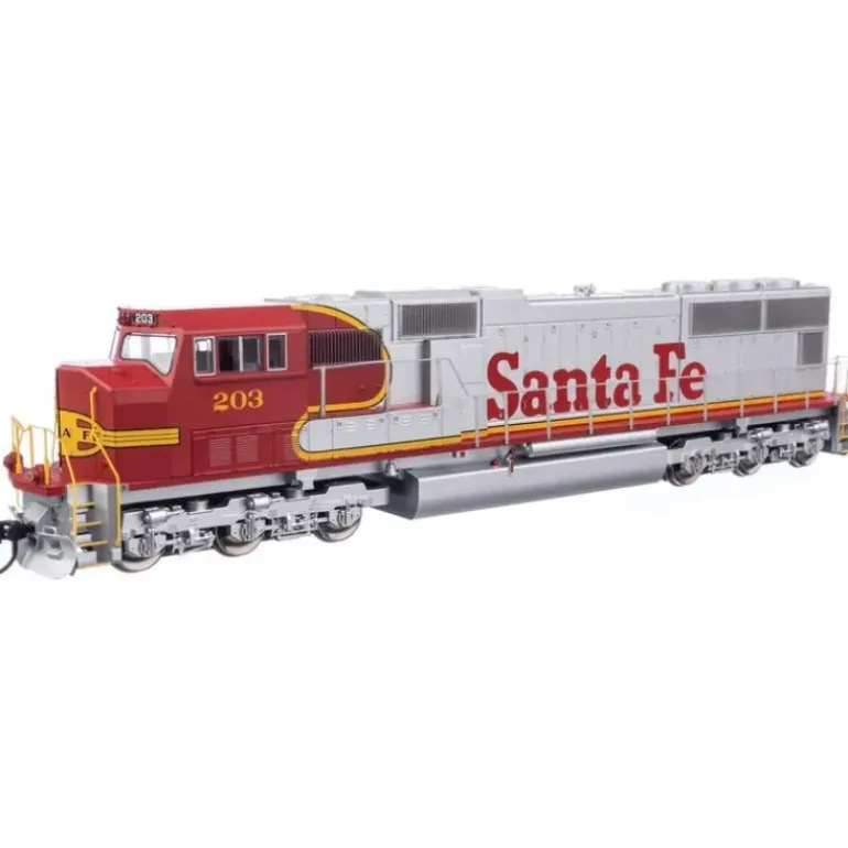 This is a Walthers 910-11001 HO Santa Fe EMD SD75M Diesel Locomotive – Standard DC #203. Features: All-New Tooling! One time run of these roadnumbers. Correct North American Safety Cab per prototype. Flush radiators per early production units. Correct HTCR-1a or HTCR-1b trucks per prototype. Brass Nathan K5 air horn. Treadplate detail on walkways. Minimum radius 18″” (22″” or larger recommended). Fully assembled. LED Lighting includes: High or low headlight per prototype, Improved, working front ditch lights, Constant and directional lights. 21-Pin DCC plug. Same powerful drive as WalthersProto(R) locos featuring: 5-pole skew-wound motor, 14:1 gear ratio, Helical-cut gears for quiet operation and easy multiple unit operation, All-wheel drive and electrical pickup, Dual machined brass flywheels, Heavy die cast metal chassis. Cab interior. 5000-gallon fuel tank w/road specific details. Standard bell on conductor’s side. Molded drill starter points for grab irons – easily added with SD70-Series Diesel Detail Kit (910-261, sold separately). Correct size RP-25 metal wheels. Proto MAX(TM) magnetic metal knuckle couplers. Road-specific details on this model include: High headlight. HTCR-1a trucks. Nose door with window.