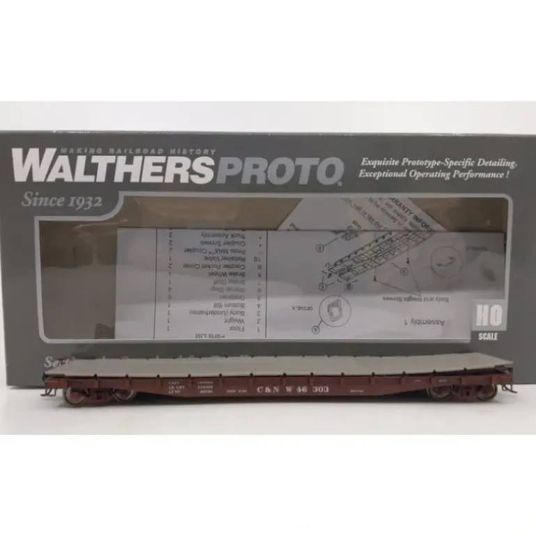 This is a Walthers 920-104118 HO Chicago & North Western 53′ AAR Flatcar – Ready to Run #46303. From the 1940s to the 80s and beyond these WalthersProto 53′ AAR Flatcars are a must-have for transition-era freight service. On the eve of WWII, the government asked the Association of American Railroads (AAR) to review contemporary freight cars, and designate some standard designs that could be built quickly for use by any railroad. Among these was a 50-ton capacity flatcar based on the Union Pacific F-50-11 class introduced in 1941. The 53’6 long cars featured a riveted steel underframe, an overhanging wood deck supported by steel angles and 15 pressed steel stake pockets along each side. Tough and durable, cars of this type were built well into the 1950s, with many later converted for piggyback service or fitted with bulkheads and other load restraints for special duty. Some remained in revenue service into the 1980s, and a few can be found in maintenance-of-way fleets today.