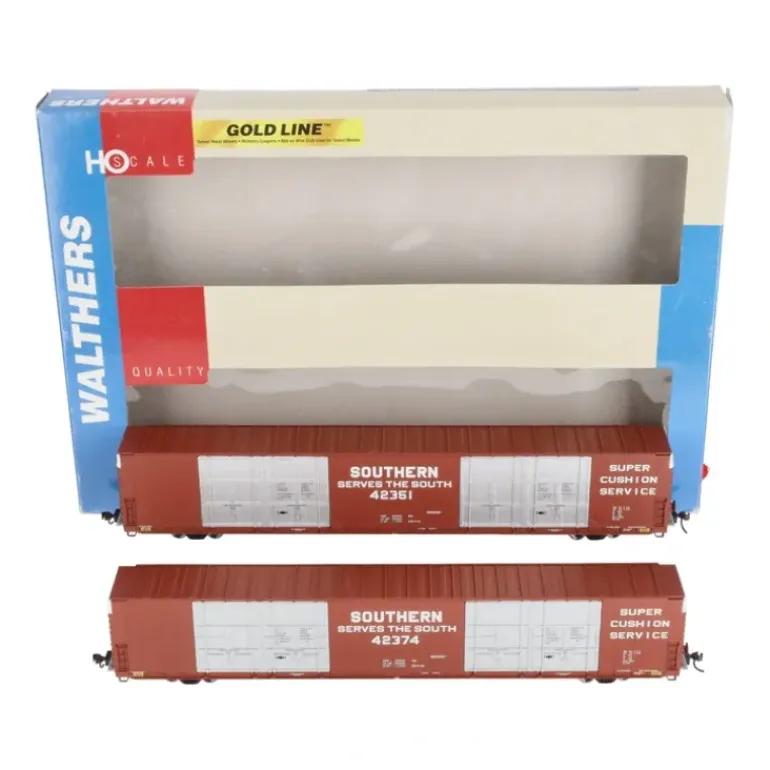 This is a Walthers 932-235311 HO Scale Southern Gold Line Pullman-Standard 86′ Hi-Cube 8-Door Boxcar (Set of 2). Take a look at any train serving the auto industry and youll see these big, colorful box cars. Introduced in the early 1960s, these cars were designed to handle parts loaded in special racks. Many of these auto parts cars are still on the road today, so theyll look at home on any post-60s freight. Finished in colorful schemes, these ready-to-run cars include working knuckle couplers and metal RP-25 wheels.