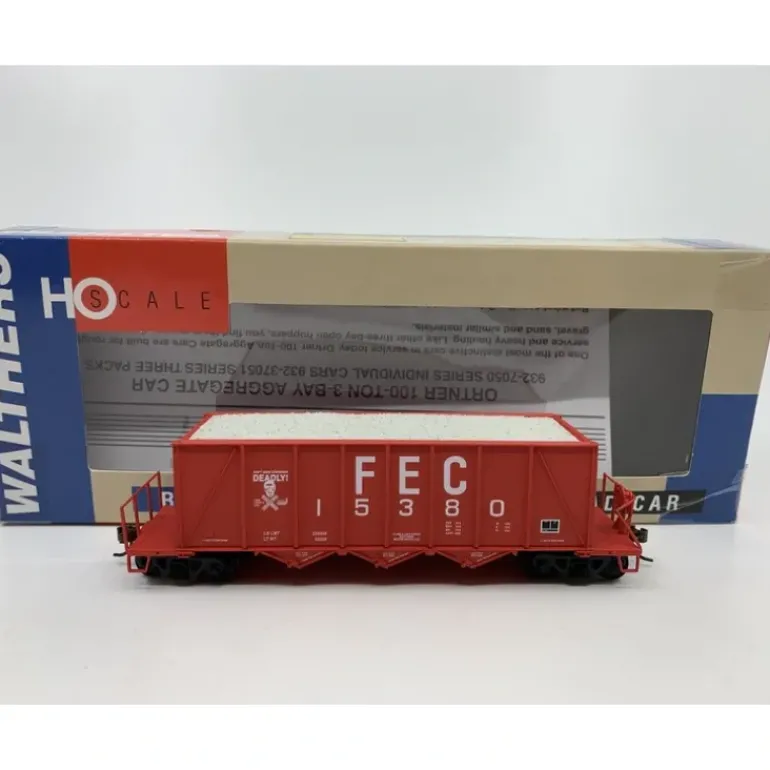 Here is a Walthers 932-7053 Florida East Coast 40′ Ortner Aggregate Car #153800. This car features plastic trucks, knuckle couplers, metal wheels and axles.