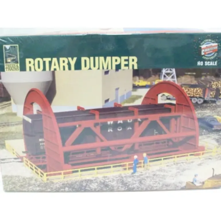Rotary dumpers can be found at all types of heavy industries that need to unload large quantities of raw materials in a hurry. At steel works, they handle hoppers of limestone as well as coal for the coke ovens. Paper mills use them to empty woodchip cars. Powerplants make quick work of unloading unit trains without uncoupling cars. In any setting, this detailed model captures the look of the real thing for your layout. Detailed styrene components simulate the heavy steel construction of the prototype and include positionable turning machinery. (Mechanically inclined modelers will find this kit makes a great starting point for an animated model!) A safety fence, decal signs and other details are included. Finished model measures: 9-1/2 x 7-1/4 x 3″ 23.7 x 18.1 7.5cm.