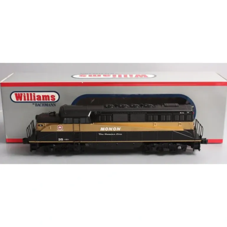 Here is a Williams 20307 O Gauge Monon BL-2 Diesel Locomotive #35. The locomotive navigates 027 curves. The length is 15, height is 4. It has 4 wheel trucks w/traction tires, powered by dual motors, flywheel coasting action, also includes a True Blast II digital horn and bell, die-cast trucks, truck sides,pilots, and fuel tank, dual headlights,19 individually installed grab irons and handrails.