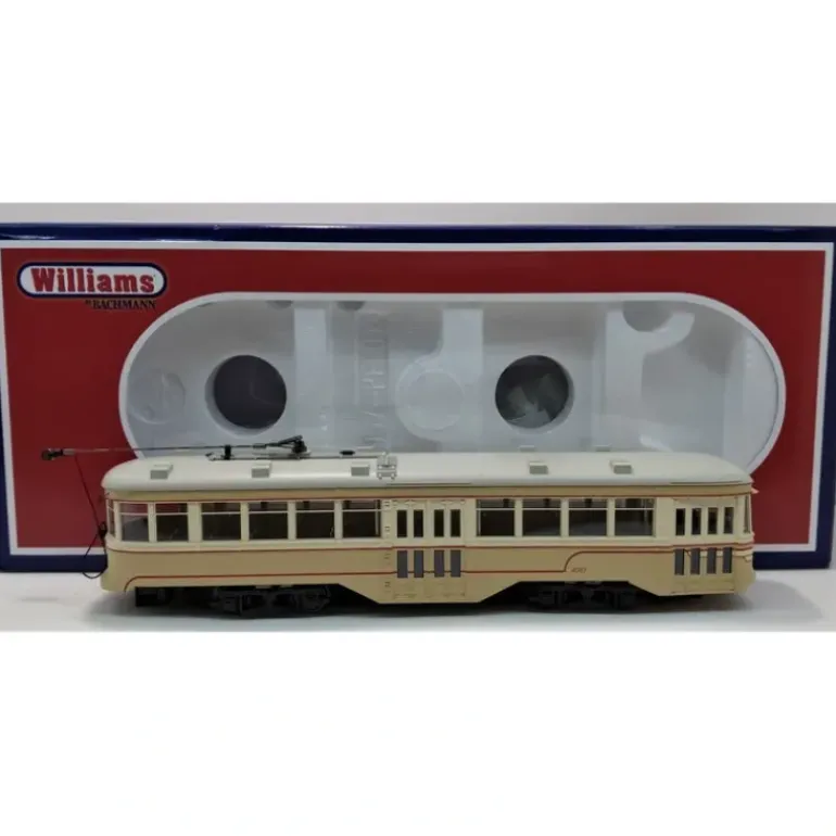 Here is a Williams 23908 O Cleveland Peter Witt Street Car #4067. While serving as Cleveland’s Street Railway Commissioner, Peter Witt designed an all-steel, single-operator streetcar that distinguished itself from others of the era by its use of the center door as an exit only. Passengers could pay the waiting conductor as they boarded at the front and exited at the center of the car, an arrangement which reduced stop times, improved schedules, and increased efficiency. Though designed originally for Cleveland, the Peter Witt Street Car went on to service in cities throughout the world from the 1930s until the early 1960s.