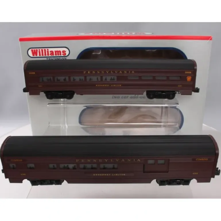Here is a Williams 43006 PRR 60 Ft. Aluminum Streamliners Combine & Diner Set. The Passenger Cars will navigate 031 curves. The car length is 16, and the height is 3.5. It includes a aluminum extrusion, ABS car ends, passenger silhouettes in the windows, painted graphics, die-cast trucks, oil impregnated journal bearings, dual lights, plus it is a perfect match for PA Sharks, F7, and FA1 diesels. The 2 car sets include one combine and one diner car.