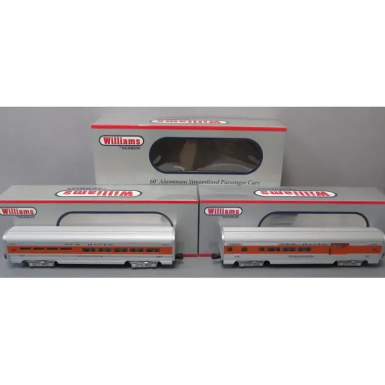 Here is a Williams 43012 New Haven 60 Ft. Streamline Passenger 2-Pack Set. The Passenger Cars will navigate 031 curves. The car length is 16, and the height is 3.5. It includes a aluminum extrusion, ABS car ends, passenger silhouettes in the windows, painted graphics, die-cast trucks, oil impregnated journal bearings, dual lights, plus it is a perfect match for PA Sharks, F7, and FA1 diesels. The 2 car sets include one combine and one diner car.