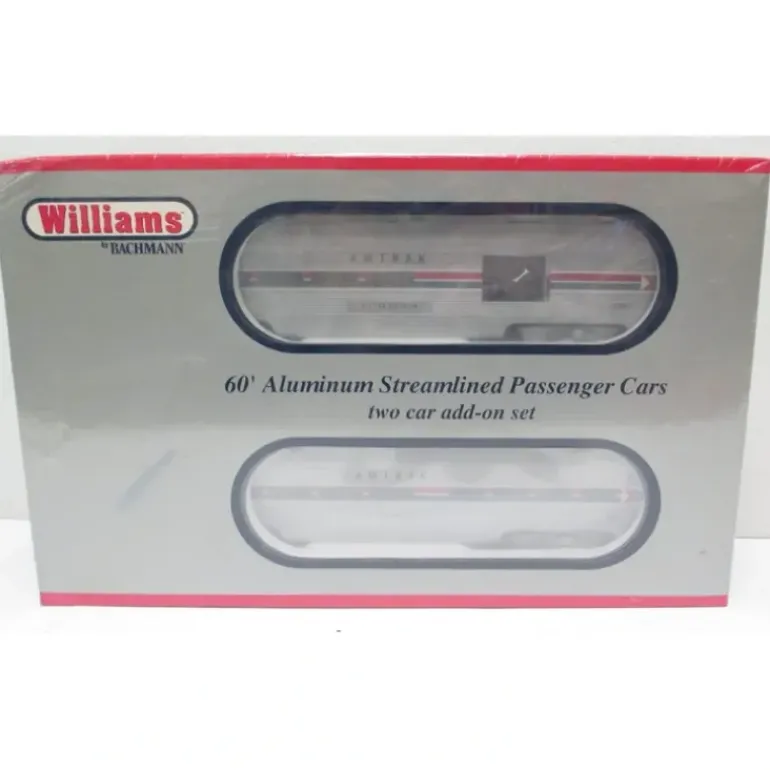Here is a Williams 43027 O Gauge Amtrak 60′ Aluminum Streamliner 2-Car Combine/Diner Set. Product Information: navigates 0-31 curves single-car length 16, height 3.5 aluminum extrusion ABS car ends passenger silhouettes in window painted graphics die-cast trucks oil impregnated journal bearings needle point axles die-cast operating couplers dual lights (each car) perfect match for PA, Sharks, F7, and FA1 diesels. Car sets include one combine and one diner car
