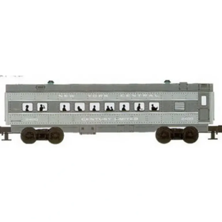 Here is a Williams 43253 NYC 027 Streamline Passenger 4-Pack Set. The cars navigates the 027 curves. Features include: Car length is 12, Height is 3.25, durable ABS plastic shell, passenger silhouettes, painted graphics, illuminated marker lenses for the observation car, did-cast 4-wheel trucks, needle point axles, fast angle, metal wheels, die-cast operating couplers, set includes: two coaches, one vista dome, and one observation car. They are a perfect match for Berkshires, 027 Hudsons, 027 Alcos, and the S2 Turbines.