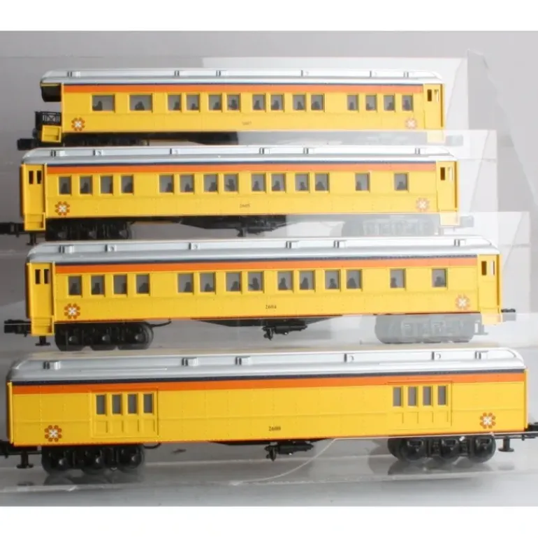 Here is a Williams 43453 Chessie 60′ Madison Passenger Car 4-Pack Set. This set navigates 031 curves. Features include: single-car length 15.5, height is 3.25,durable ABS plastic shell, die-cast trucks, needle point axles, die-cast operating couplers, fast angle powdered wheels, passenger silhouettes in windows, painted graphics. The four-car set includes one Baggage car, two Pullmans, and one Observation Car. They are a perfect match for Berkshires and 027 Hudsons.