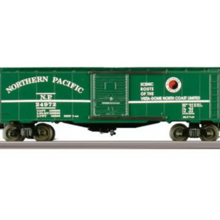 Here is a Williams 47015 O Gauge Northern Pacific 40′ Boxcar. This car navigates 027 curves. Features include: car length 10, height 3.5, durable ABS plastic shell, die-cast trucks, metal wheels, operating couplers, prototypical graphics, metal floor, door guides, and a brake wheel.