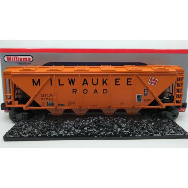 Here is Williams 47606 O Scale Milwaukee Road 4-Bay Hopper #98744. This car features a durable ABS plastic shell, die-cast trucks, operating couplers, and metal wheels.