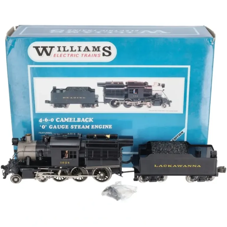 This is a Williams 5016 BRASS Lackawanna 4-6-0 Camelback Steam & Tender (3-Rail) #1024. The locomotive features an operating smoke unit, flywheel coasting drive train, electronic reverse unit with lock-out switch, operating headlight, operating marker lights, operating back up light, a conductor figure, die-cast metal truck sides, die-cast metal operating knuckle coupler, metal wheels and axles. The tender features die-cast metal trucks, die-cast metal operating knuckle coupler, metal wheels and axles.