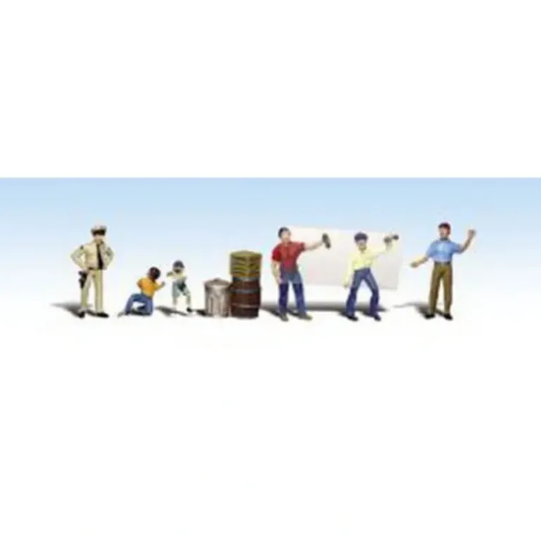 This is a Woodland Scenics A1893 HO Accident Waiting to Happen Figures (Set of 7). A set of three glass workers. One glazer guides two others, carefully carrying a very large pane of glass with suction cups. Two boys hide behind trash barrels with their slingshot loades, ready to shoot under a policeman’s watchful gaze.