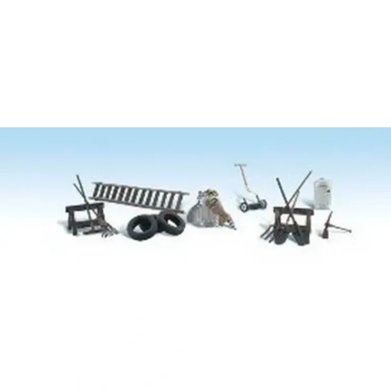 This is a Woodland Scenics A1928 HO Scenic Accents Garage Treasures (Set of 13).