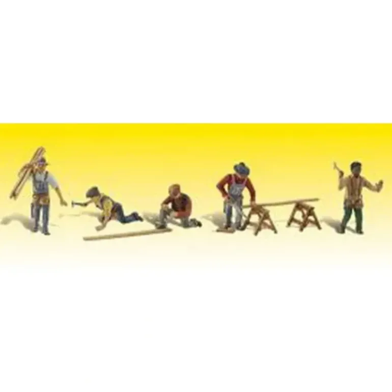 From hammering to sawing boards to schlepping lumber, these five busy carpenters are perfect for the on-going construction areas of your layout.