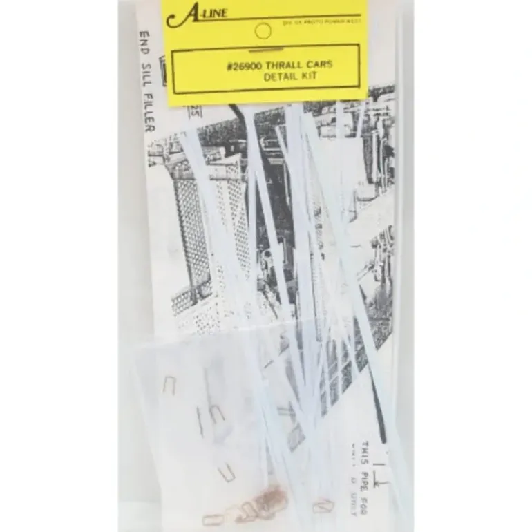 This is an A-Line 26900 HO Scale Thrall Double Stack Container Car Extra Detail Kit. Includes formed wire grab irons, stirrups, handbrake chains/guides, air reservoir/valve piping, well support/stiffener strips, lift ring gussets, end load guides and additional electrical version details. Includes parts for one five-unit car.