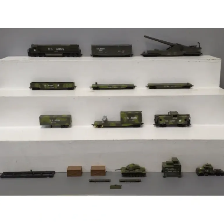 Here is an AHM 10325 US Army HO Gauge Diesel Train Set. This set includes a lighted 8-wheel drive diesel locomotive, M-47 tank with 51 foot flatcar, tank buster, big thunder railway gun, Army truck and trailer with 51 foot flatcar, searchlight command center, gondola with load & a operating ammo carrier. Features include plastic construction, plastic trucks, horn-hook couplers, metal or plastic wheels, and one motor.