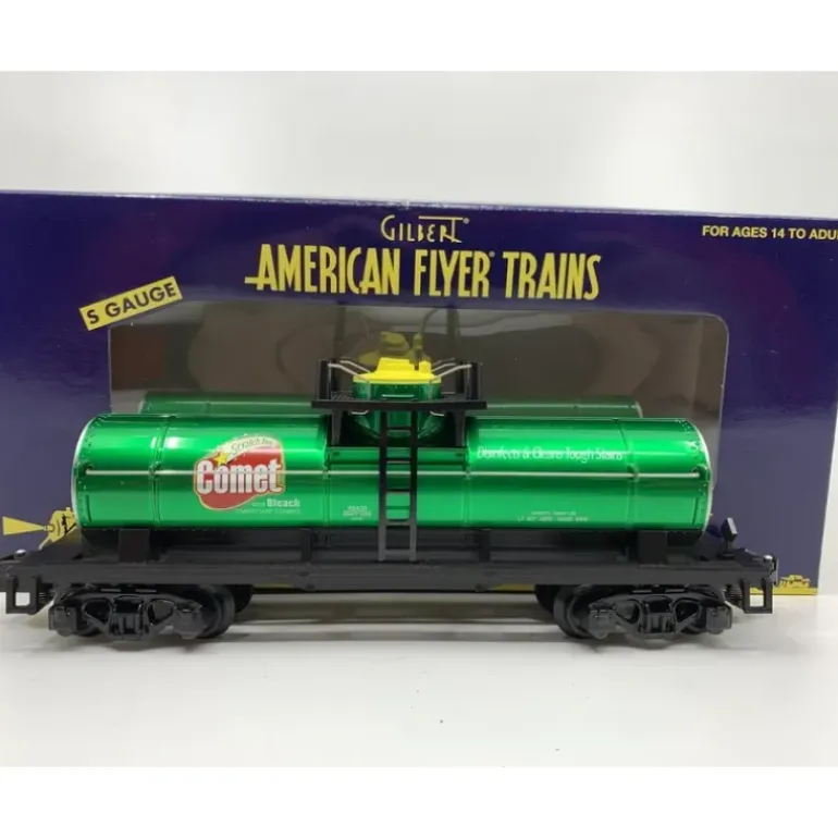 Here is an American Flyer 6-48430 S Gauge Comet Single Dome Tank Car. This car features die-cast metal sprung trucks, operating knuckle couplers, plastic wheels, and metal axles.