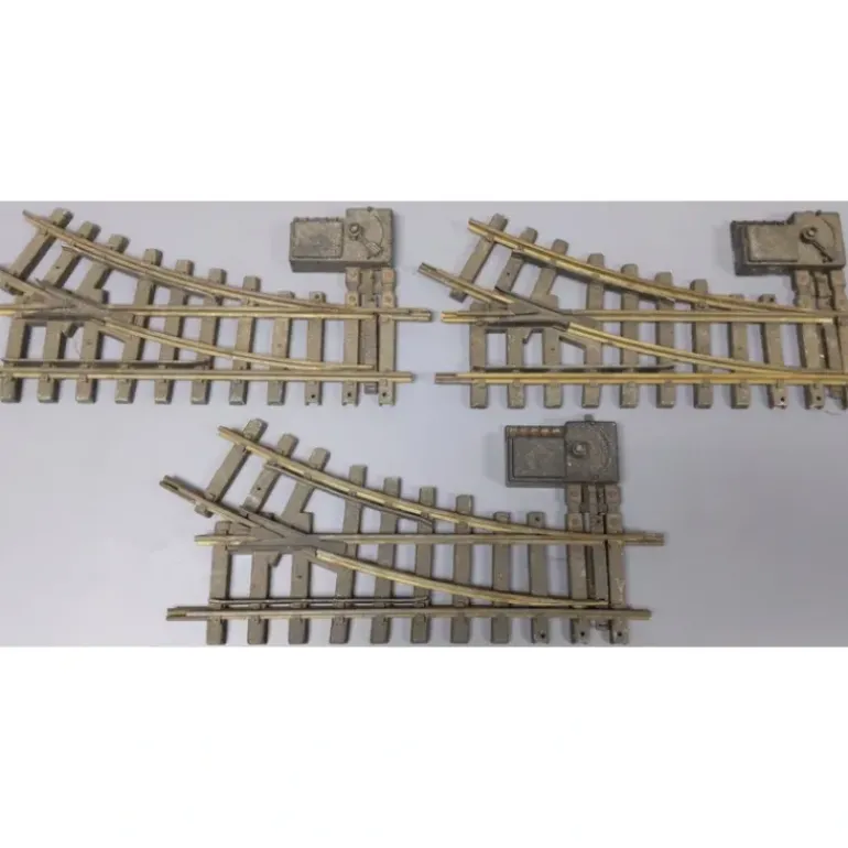 Here are 3 Aristo-Craft 11200 G Scale Euro Brass Right Hand Manual Switch Turnouts (3). Features include plastic ties and brass rails.