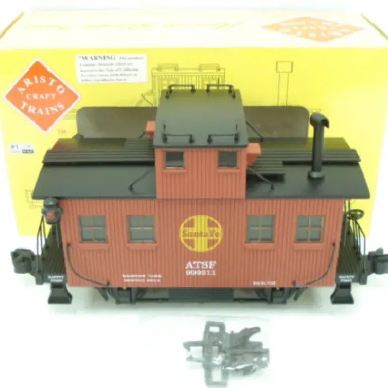 This is an Aristo-Craft 22505C Santa Fe Bobber Caboose. Features include plastic construction, plastic trucks and wheels, and plastic couplers.