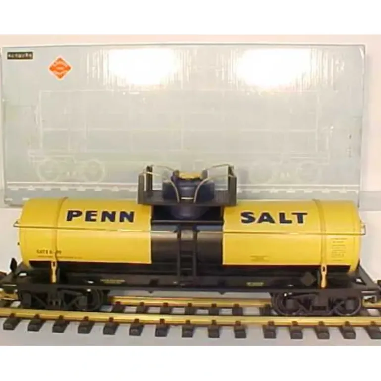 Here is an Aristo-Craft 41399 Penn Salt Single Dome Tank Car – Plastic Wheels. It has Operating AAR-Design Knuckle Couplers and the following: