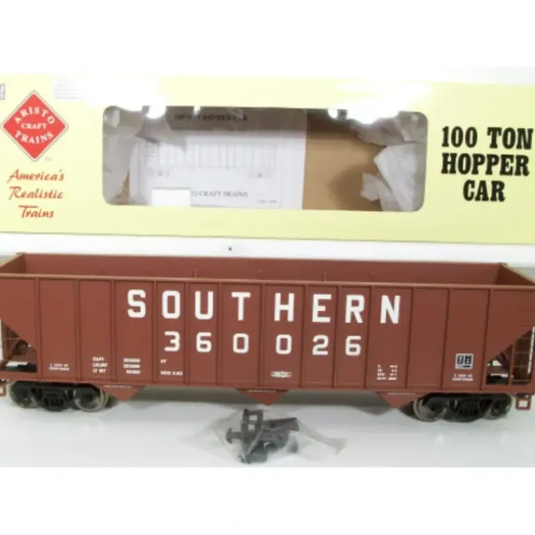 Here is an Aristo-Craft 41413 100 Ton Coal Hopper Southern (SR) featuring metal wheels and a coal load.