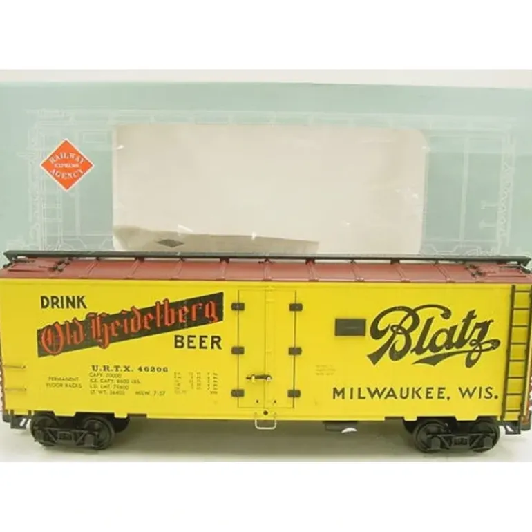 Here is an Aristo-Craft 46206 G Scale Blatz Beer Refrigerator Car. This car features front and rear operating AAR knuckle couplers, detailed freight car trucks/wheelsets with individual springs, operating body doors with moveable latch, operating roof-hatch doors with moveable latch, three-dimensional ladders on ends and sides, brass grab-railings, full underframe, including Air Brake System components, simulated wood-grain flooring, realistic paint colors and railroad markings. This car is equipped with plastic wheels. Minimum 4 foot curve required.