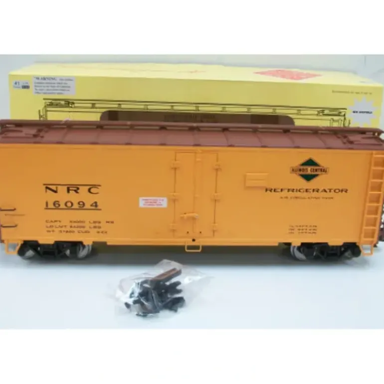Here is an Aristo-Craft 46246S IC Reefer Car #16094 (Metal Wheels). Features include heavy-duty sprung plastic trucks, metal wheels and axles, operating knuckle couplers,, opening side doors and rooftop hatches, a detailed underframe with molded brake system and separately-applied metal grab irons. It measures approximately 17″ long. Road number 16094.