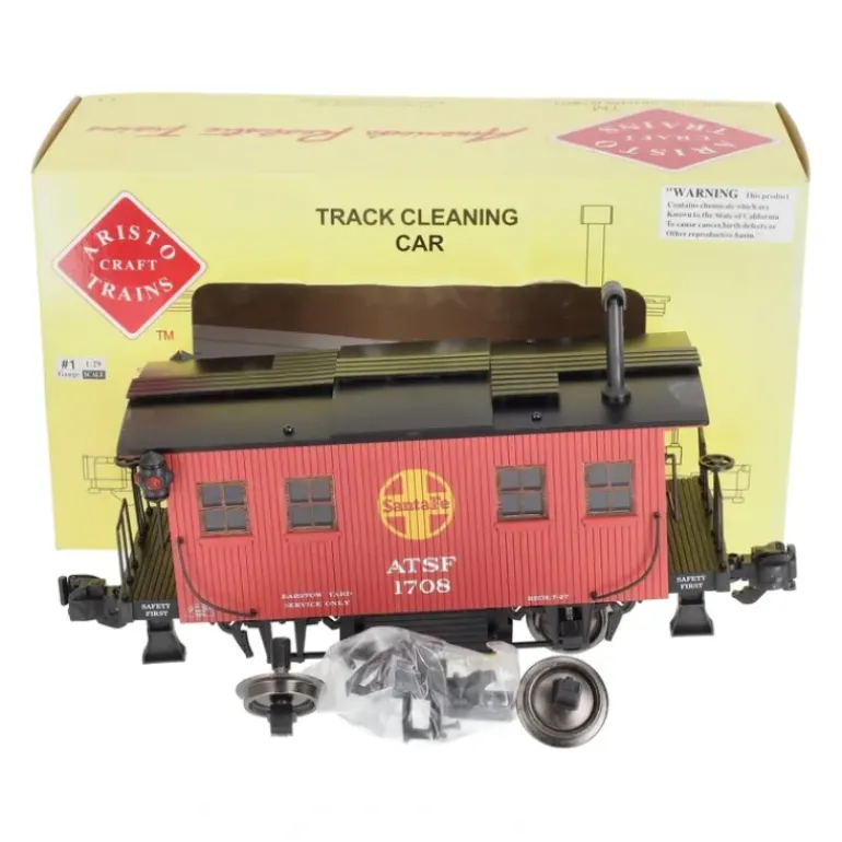 Here is an Aristo-Craft 46954 G Scale Track Cleaning Caboose. Features: – Clean your track while running your trains!!! – Removable Abrasive Cleaning Pad – Front / Rear Operating AAR Knuckle Couplers – Black metal wheel with sprung axles – Simulated WOOD GRAIN sides, ends and walkways – Clear plastic windows with simulated wood frame – Realistic Painting & Crisp Detailing