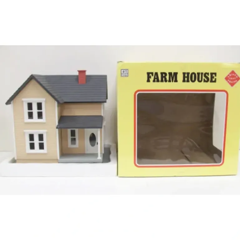Here is an Aristo-Craft 7203 G Tan Farm House. It is constructed of durable, weatherproof, pre-colored plastic and measures about 13 inches by 12 inches.