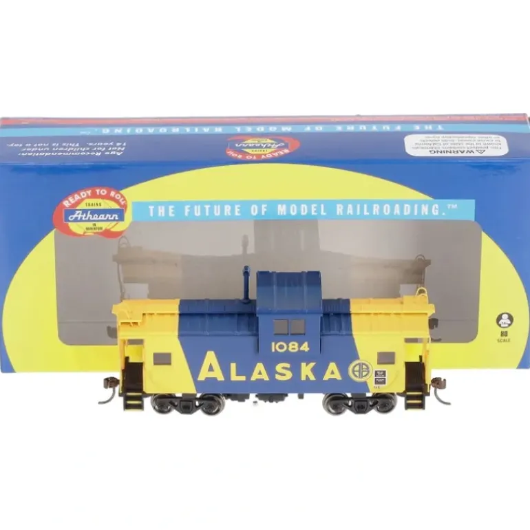 This is an Athearn 29371 HO Scale Alaska Wide Vision Caboose #1084. Model Features: Fine end handrails and ladders , Clear windows , Caboose trucks , Separately applied smoke jack and brake wheel , Fully-assembled and ready to run , Highly-detailed, injection-molded body , Painted and printed for realistic decoration , Machined metal wheels , Weighted for trouble free operation , Wheels with RP25 contours operate on Code 55, 70, 75, 80, 83, 100 rail , Body mounted McHenry operating scale knuckle couplers , Window packaging for easy viewing , Interior plastic blister carton safely holds model for convenient storage , Minimum radius: 18.