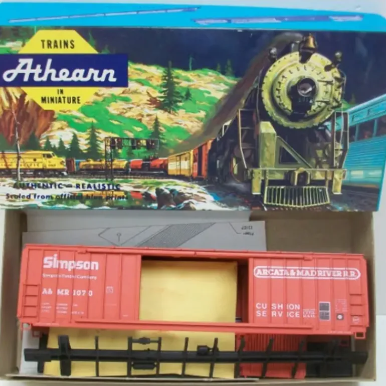 Athearn 5072 Arcate & Mad River 55′ Railbox Boxcar Kit. This car features plastic construction, plastic trucks, plastic wheels, metal axles, and plastic knuckle couplers..