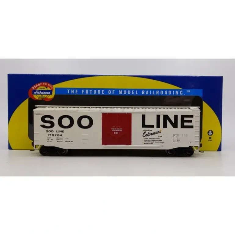 This is Athearn 71952 SOO #178264 HO RTR 50′ Smooth Side Plug Door Box. Its key features includes Fully assembled and ready for your layout, Razor sharp painting and printing, Weighted for optimal performance, Machined RP25 profile 33 metal wheels, McHenry scale knuckle spring couplers installed.