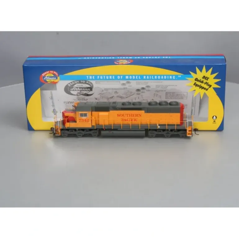 Here is an Athearn 89885 HO Scale Southern Pacific SD40 Diesel Locomotive #7342. This locomotive comes fully assembled and ready for your layout. It features factory installed wire grab irons, factory installed Celcon handrails, detailed fuel tank with correct capacity, see-through fans, available with and without dynamic brakes as appropriate, DCC ready wiring harness installed, directional headlights, machined RP25 profile metal wheels, McHenry scale knuckle spring couplers.